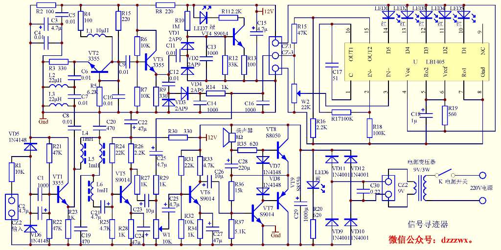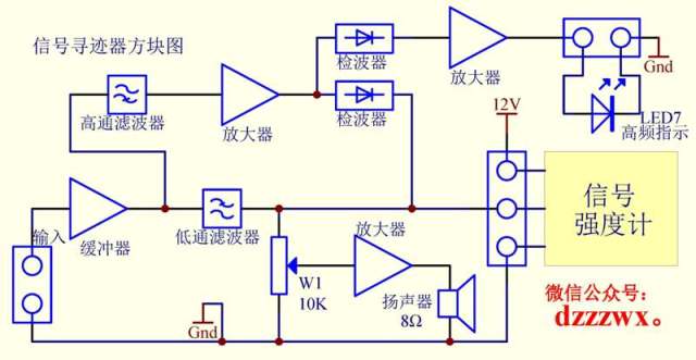 它的工作原理是明顯的,為了初學者的需要稍作說明。 輸入信號通過寬頻射極跟隨器VT1作阻抗變換后,低頻信號通過低通濾波器經VT3做 放大后由R27、C23輸出并分成兩路:一路經電位器調整幅度以后經功放推動揚聲器作音響指示;另一路由R29、C25至LED分級電平指示電路作指示,因為在這一通路中有電容的存在直流電平不會被指示。 當輸入的是高頻信號時,經一級共集電極和一級共基極電路放大, 分成兩路:一路經C11作倍壓檢波,輸出推動VT4作高頻指示;另一路經C12作倍壓檢波 ,檢波后的低頻信號也分成兩路:一路經至LED分級電平指示電路作指示,因為是直接耦合,當輸入的是高頻等幅信號時也可指示其直流分量;另一路經C25、R29由電位器調整幅度以后經功放推動揚聲器作音響指示。 出了用LED7作高頻指示外,還可以根據一下兩點區分信號性質。 一是高頻等幅信號沒有音響輸出,僅有LED分級電平指示電路的指示。如果是高頻調幅信號,檢波輸出的音頻分量在LED分級電平指示電路上的指示基本上不受W1的影響,這樣 也可以區分被測信號的性質。區分如下: 1、當LED分級電平指示電路 有指示,而沒有音響指示時是高頻等幅信號。 2、當LED分級電平指示電路有指示,同時又有音響輸出,而且LED分級電平指示電路的指示強度受W1的調整影響不大時,是高頻調幅信號。 3、否則是低頻信號。 二是因為有VT3的阻隔,檢波輸出的音頻信號不會反送至CZ1,而有可能對被測電路的高頻電路產生有害的調制。 安裝調試簡單,簡述如下: 1、 調整R15、使R3上的電壓為2.3V。 2、 調整R24使VT5的集電極電壓在7V左右。 3、 調整R31使VT6的集電極電壓在7V左右。 4、 調整R36使VT8、VT9的中點電壓為電源電壓的一半。斷開VT8或VT9集電極測一下靜態電流應有1mA左右。如太小,可在VD7或VD8上串聯一個電阻,調整此電阻使靜態電流滿足要求;反之則把VD8或VD9去掉,換成一個100Ω左右的電阻調整 使之滿足要求即可。在此要特別注意接通電源時VT8、VT9的基極通路決不能斷開,否則會把VT8或VT9燒毀。如果你按拙文“可調穩壓穩流源”制作了該電源,現在就派上用場了,調整該電源的輸出電壓為尋跡器的電源電壓,輸出電流為10mA左右。臨時代替尋跡器電源進行調整,可完全避免上述情況發生。 安裝完成后,在輸入端接以天線應有雜亂的廣播聲,則說明制作無誤。這時在輸入端接一個調諧電路就是直接高放式收音機。