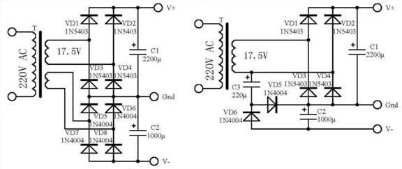 W1應采用指數式電位器,以保證在小電流時有比較好的控制特性。 如果你沒有中心抽頭的變壓器,可以采用右圖的兩種輸入電壓電路: 當采用左邊的電路時,如果負電壓相差較大,整機原理圖下部的元件應作相應調整。 其他元器件無特殊要求。 三、調整 安裝無誤后,僅有以下幾處需要調整: 1、 將W1旋至最上方,調整R3使輸出電流為最大值;將W1旋至最下方,調整R7使輸出電流為最小值。 2、 將W2旋至最上方,調整R12使輸出電壓剛不為負值;將W2旋至最下方,調整R7使輸出電壓為最大值。R12、R20互有影響,需反復調整幾次,使電位器旋至一端時電壓為0,旋至另一端時為最大值 。 3、 調整R19使VT9漏極電流為4mA. 4、 R22、R23、R24可聯立以下三式解出:I3×(R22+R23+R24)=I0×R0 I2×(R23+R24)=I0×(R0+R22) I1×R24=I0×(R0+R22+R23) 式中I0是你的電流表的靈敏度,R0是你的電流表的內阻,I1=1A、I2=0.1A、I3=10mA是分流后的電表量程,以上五個量都是已知數。只有R22、R23、R24是未知量,有初中文化的即可極易解出。 四、使用