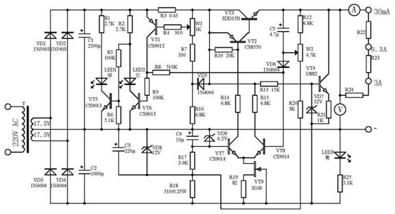 穩壓穩流性能良好,在輸出電壓很低的情況下,仍有很好的恒流特性。 5、 除作電源用外,可以很方便的用來精確的測試某些非線性電子器件的參數和繪制伏安特性曲線,以及用來為蓄電池充電,或激活蓄電池等。 6、 采用半導體分立器件,有利于制作者對電子知識的理解,制作也很方便。 右圖是原理圖: 整個電源由主控電路、電壓檢測電路、電流檢測電路、狀態指示電路幾部分組成。 主控電路的調整三極管采用集電極輸出方式,放大能力高,電壓損失小。為了從0伏起調,增加了一組負電源,并且采用了恒流泄放方式。這樣電壓很低時輸出端也有一定的泄放電流,既保證了作電壓源時調整電路始終處在放大狀態,也保證了作電流源時輸出電流恒定不變。 控制電流由VT8的基極輸入,當輸入電流增加時,VT8發射極電壓增加,即VT9發射極電壓增加,進而使VT9發射結電壓降低,VT9集電極電流降低,VT2、VT3導通降低,輸出電壓或電流將下來。 反之,則VT2、VT3導通加劇,分析同。 電壓檢測接在輸出端與-12V之間。因為R8、R9阻值很大,所以對這電壓檢測電路影響不大。 電流檢測由R8接入。VD5兩端-0.7V的電壓經W1分壓后加至VT1的基極,當這個電壓U1加上通過R3的電流所產生的電壓 降 U1+ I×R3=0.6V 時,VT1導通進入恒流狀態,由上式可得 I=0.6V/R3-U1/R3 因為R3是一個常數,由上式可以看出I的大小取決于U1的大小,并且U1=0時I最大,為0.6V/R3,U1=0.6V時I=0。這樣就可以通過調整U1的大小來調整輸出電流的大小。 VT5和VT6用來指示電源的工作狀態。工作在穩壓狀態時VT5通過R2、R5得到基極電流而導通,LED1亮,說明工作在穩壓狀態;當電流增加VT1導通時,通過R9使VT6導通LED2亮,說明工作在穩流狀態。同時使VT5的基極電壓降至它的導通電壓以下,LED1滅。LED3為電源指示燈。 二、元件選擇