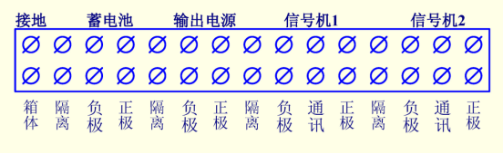 蓄電池和光伏電池都連接在三芯總線上。蓄電池與光伏電池+極接總線+,蓄電池與光伏電池-極接總線-。 安裝時,室內按下面接線排的圖示接上保護接地,蓄電池和兩架信號機。室外在白燈內插上兩盞紅燈,揚聲器,白燈已插上。光伏電池并接在總線上即可。 為了便于取用電源和檢修更換。一般蓄電池放置在道口房內,光伏電池板安裝在信號機或者道口房處,但都以現場情況確定。 下面是接線排接線圖: