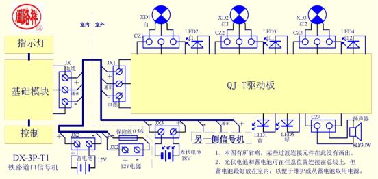注意:因批次不同可能有所不同。 三、使用方法: 1、按下控制按鈕,控制箱紅色復示指示燈亮,信號機兩盞紅燈交替閃光,音響發警鐘聲和“小心火車,注意安全”的語音提示聲,綠色音響指示燈作音響指示。 2、音量旋鈕控制音響音量,臨近居民區應注意調整,以防擾民。 3、控制按鈕抬起,控制箱白色復示指示燈亮,信號機白色信號燈亮。 四、功能特點: 1、 總線+、通訊、-都是連接一起的。 2、 如果需要輔助控制盒也連接在三芯總線上。 3、 驅動板安裝在位置較低的白燈內,安裝、維修方便。 4、整機工作由通訊線的狀態決定,同時傳輸音頻信號。 5、控制箱復示白燈、紅燈、滅燈的三種狀態與控制箱控制按鈕的狀態無必然聯系,而取決于信號機的狀態。 6、信號燈也采用三線連接,由驅動板控制線控制,可避免控制元件產生的電壓損失。 五、故障導向: 1、所有故障音響停?偩+、通訊、-線斷信號機燈滅。 2、通訊線和+線短路燈滅,和-線短路亮紅燈。