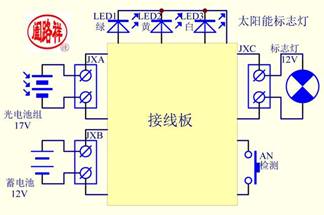 蓄电池安装在防水盒内,光伏电池板、蓄电池、标志灯均接于里面的接线板上。光伏电池通过该板给蓄电池充电,蓄电池通过该板向标志灯供电。 光伏电池光照下降到一定程度,自动启动蓄电池向标志灯供电。 接线板有LED显示设备的工作状态,为了避免蓄电池电流在显示LED上的浪费,设置了一个测试按钮,仅在按钮按下时LED发光。 其中绿色显示光伏电池电压,黄色显示蓄电池电压,白色显示标志灯电压。在接近各自的电压下限时,亮度变化剧烈。 下面是接线示意图:
